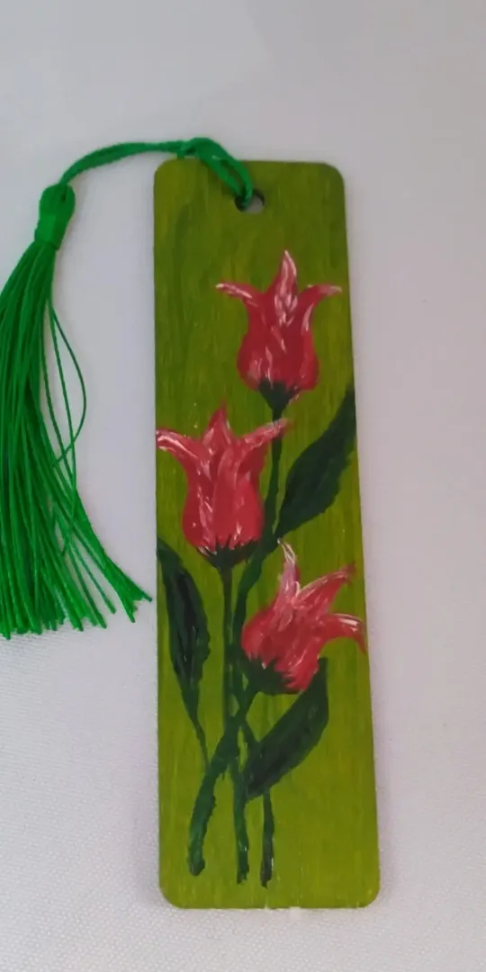 Fa lapra festett. Egyik oldala mintás. Mérete: 3*12 cm